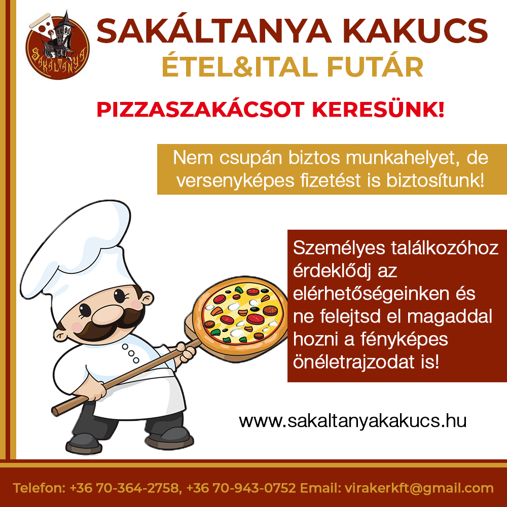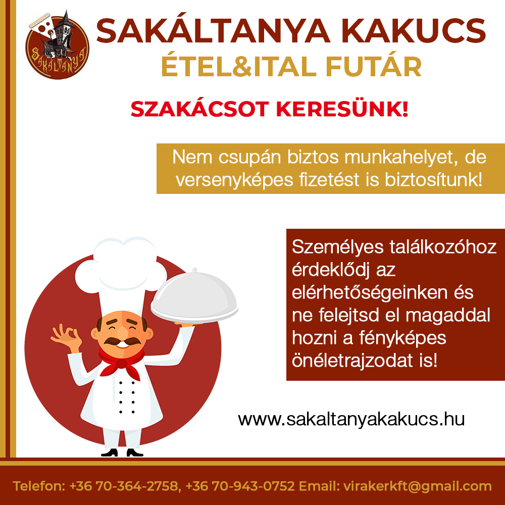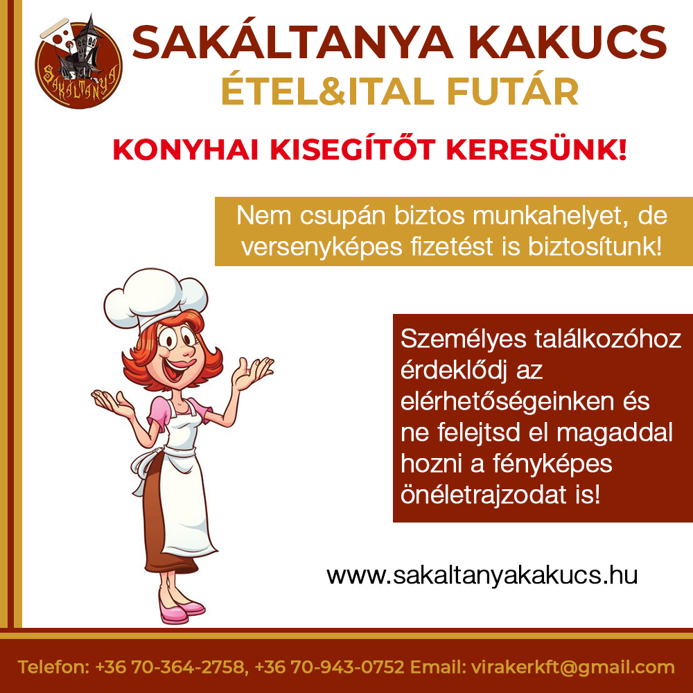 - Nem csupán biztos munkahelyet, de versenyképes fizetést is biztosítunk, ráadásul éttermünkből egy napi menü is extraként jár Neked! Személyes beszélgetéshez érdeklődj a +3670-364-2758 és a +3670-943-0752-es telefonszámokon, ne felejtsd el magaddal hozni a fényképes önéletrajzodat!